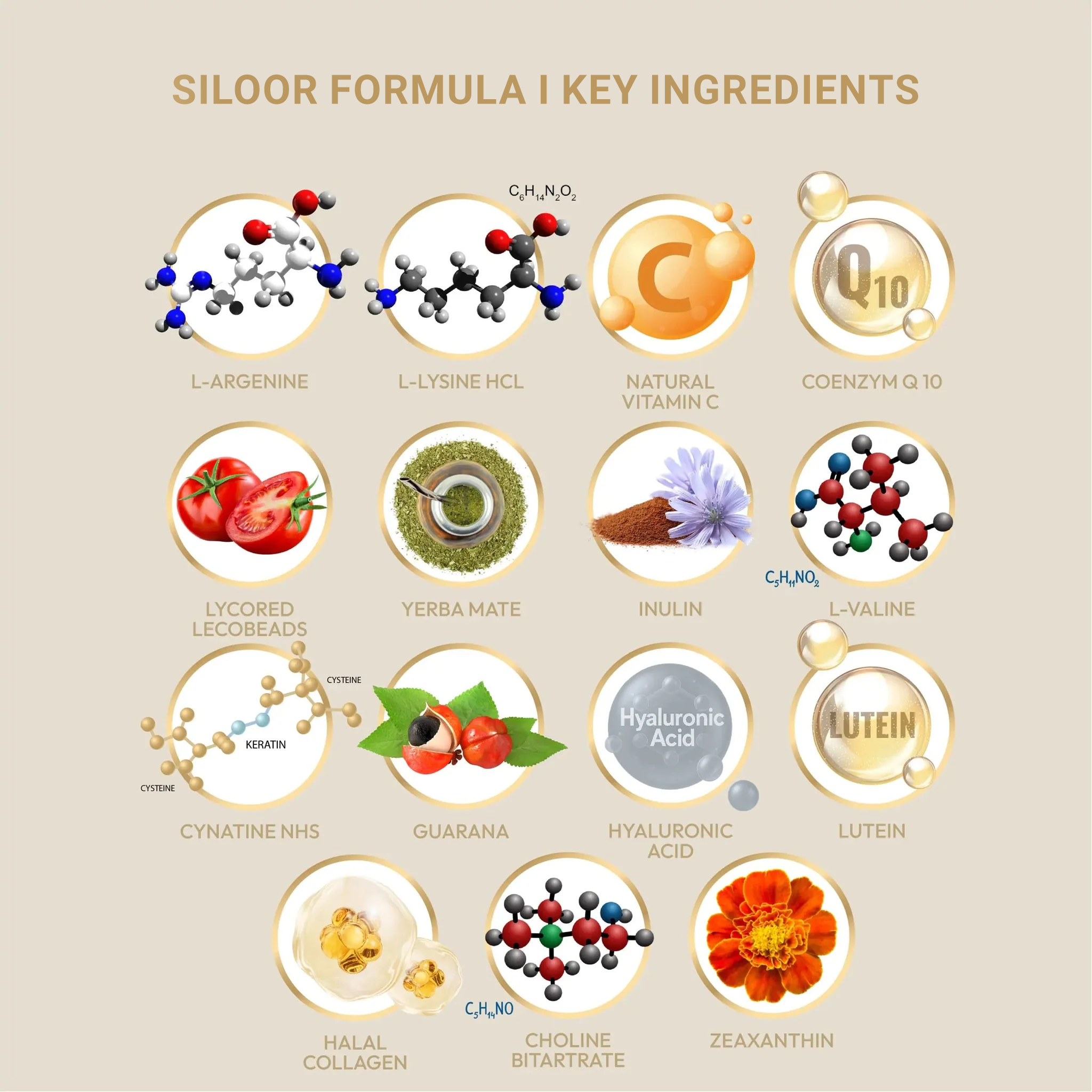 Crafted with premium amino acids (L-lysine, L-valine, L-arginine), Swiss halal collagen and Cynatine HKS for muscle and anti-aging support. Enhanced with natural vitamin C, CoQ10, guarana, yerba mate and hyaluronic acid for energy and vitality.
