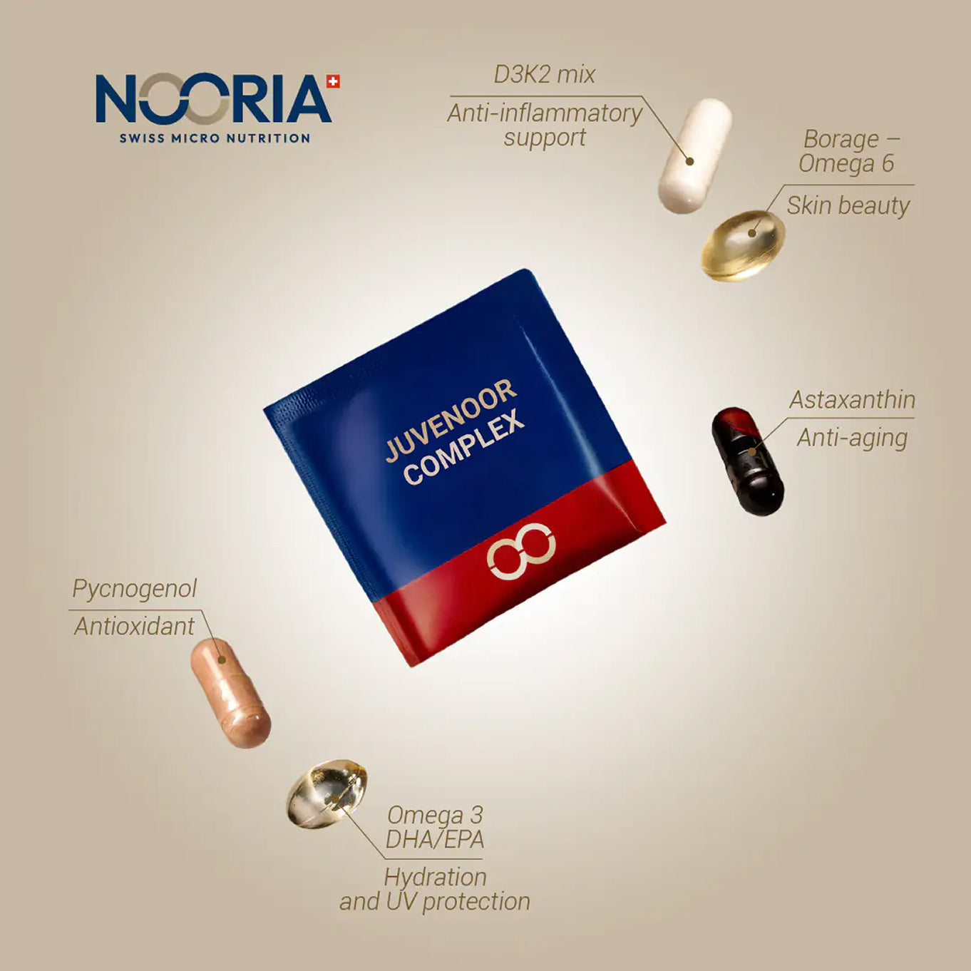 Formulated with Pycnogenol and astaxanthin for powerful antioxidant protection, enhanced with omega-3 EPA/DHA (Omégavie) and borage omega-6 for skin hydration and cellular health. Enriched with D3K2 mix for comprehensive beauty and longevity support.